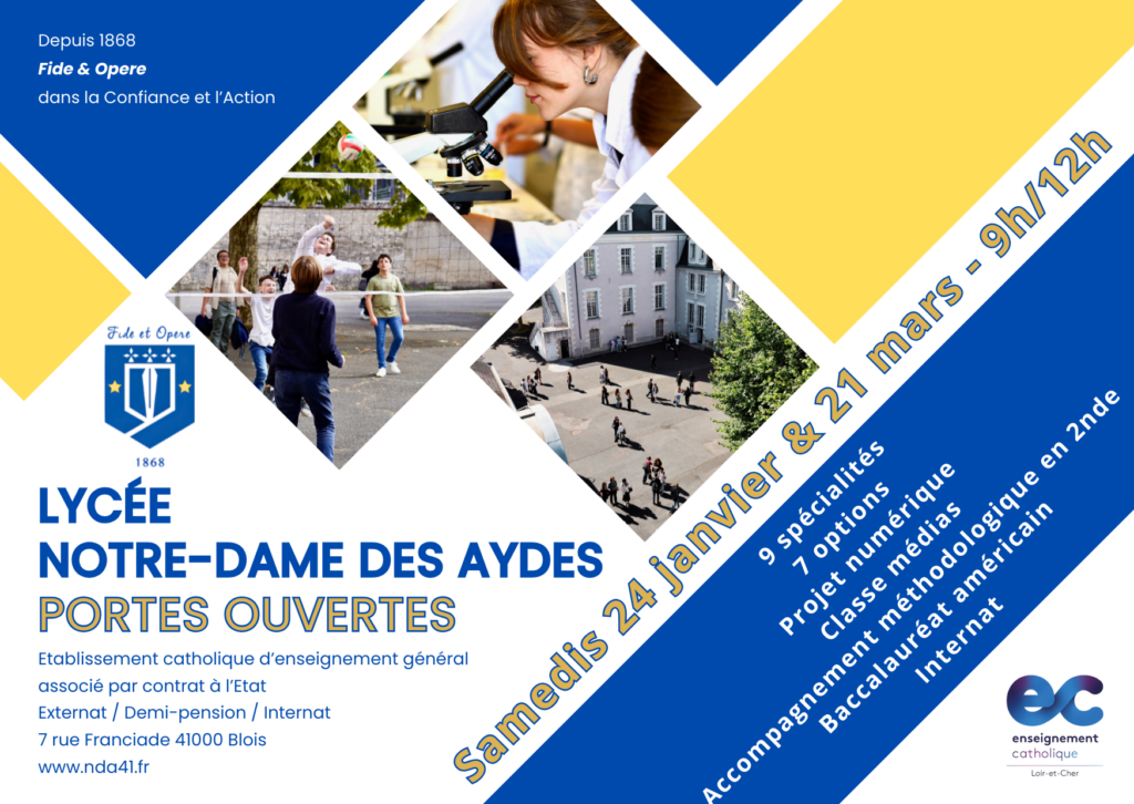Bienvenue à Notre-Dame des Aydes. Situé en plein cœur de Blois, à 10 minutes à pied de la gare, l’établissement accueille près de 400 élèves de la 2nde à la terminale dont une trentaine d’internes, garçons et filles.