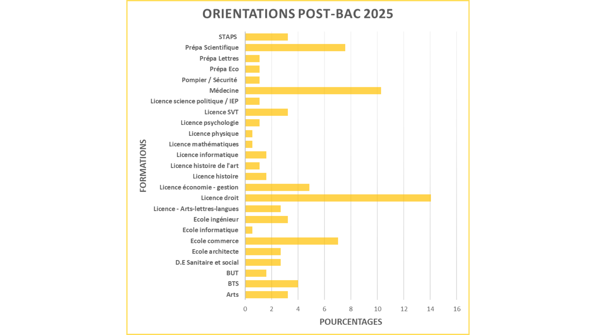 Après l’année de Terminale, nos élèves intègrent des filières très variées : BTS, BUT, écoles diverses d’architecture ou de commerce, licences mais aussi des classes préparatoires aux grande écoles ou des instituts d’études politiques.