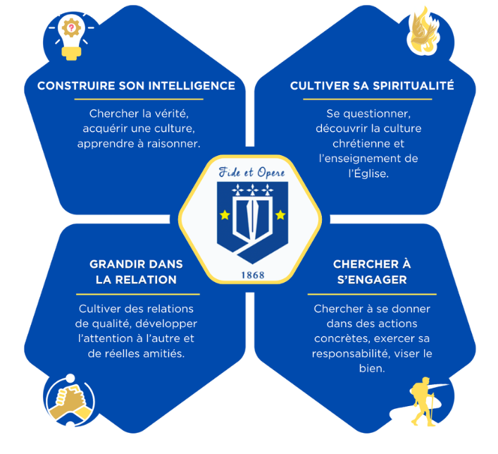 Forts de notre héritage et de notre mission au sein de l’Église catholique, nous avons élaboré ce projet éducatif, respectueux de notre tradition, afin de former des jeunes responsables, épanouis et engagés dans la société. Il engage la pleine adhésion de tous les membres de notre communauté éducative : élèves, parents, professeurs, salariés de l’établissement et partenaires.